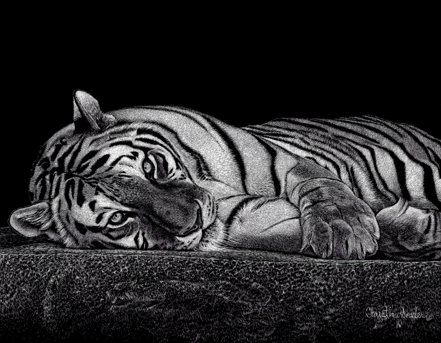 Portrait of a beautiful tiger from Brookfield Zoo. I was able to capture an amazing photo of this tiger which I used for this portrait. Done on scratch board with exacto knife. Completed 10/2024. Size 11" x 14"