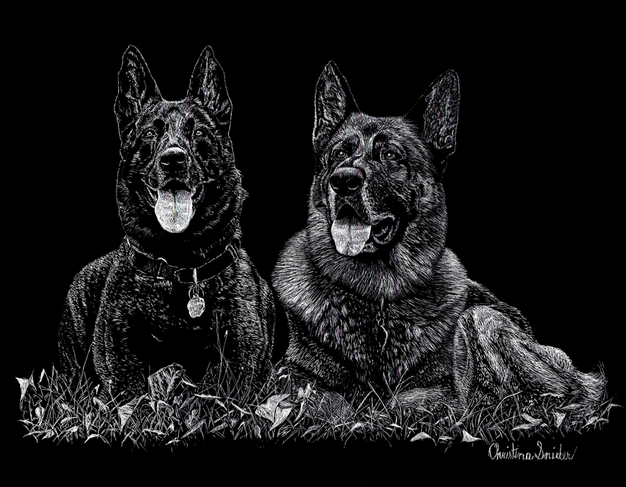 Portrait of two beautiful German Shepherds. This piece was commissioned as a Christmas gift. Done on scratch board with exacto knife. Completed 12/2024. Size 8 1/2" x 11"