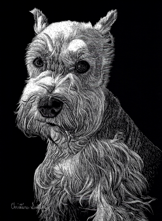Portrait of my own beloved dog, Snow White, who crossed over the rainbow bridge a few years ago. She was such a sweetheart! Done on scratch board with exacto knife. Completed 08/2024. Size 8 1/2" x 11"
