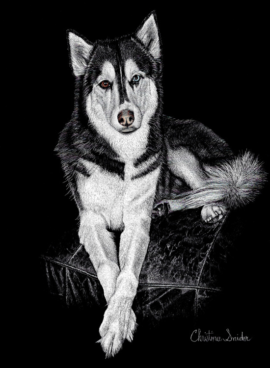 Portrait of a beautiful dog with heterochromia named Brewski. This was commissoned as a Christmas gift. Done on scratch board with exacto knife. Completed 12/2024. Size 8 1/2" x 11"