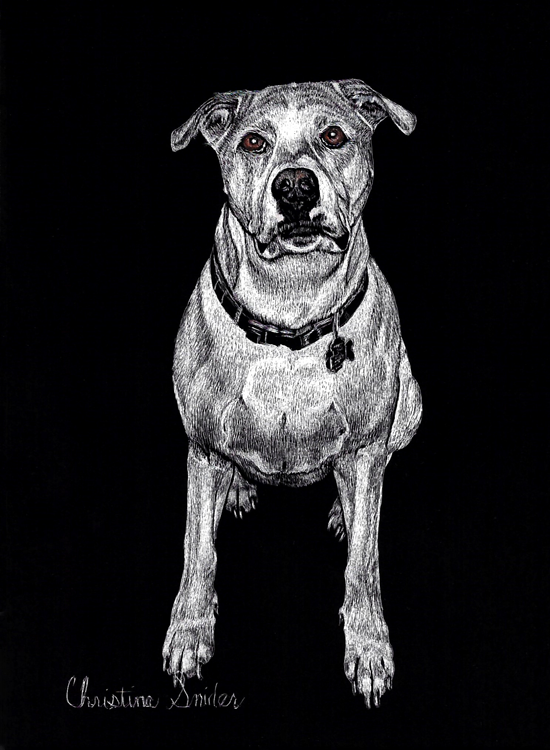 Portrait of a cute pup that was commissioned for a Christmas gift. Done on scratch board with exacto knife. Completed 12/2024. Size 5" x 7"