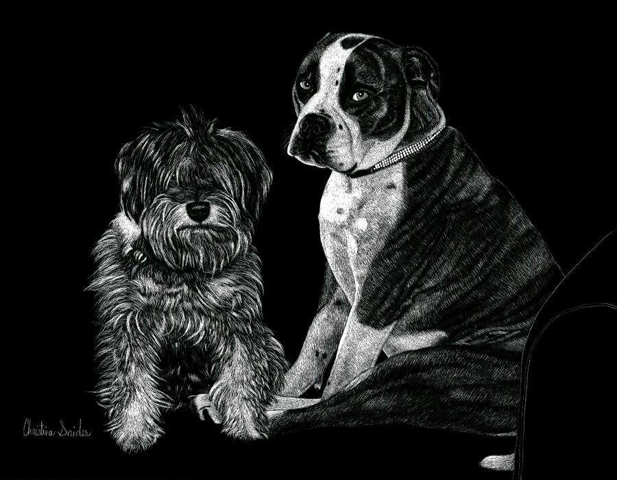 Commissioned Scratch board portrait of two cute pups! Done on scratch board with exacto knife. Size 8 1/2" x 11", Completed 01/2018.