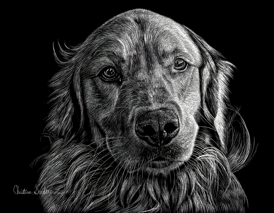 Scratch board of a golden retriever named Bo. Done on scratch board. Size 8.5" x 11", Completed 3/2015.