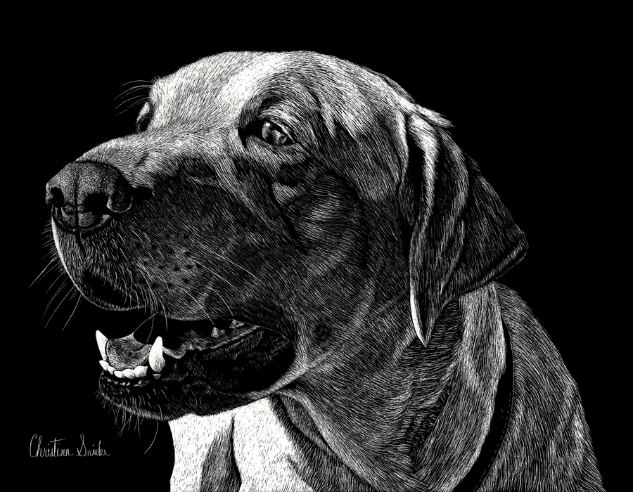 Scratch board of a golden lab. Done on scratch board. Size 8.5" x 11", Completed 4/2015.