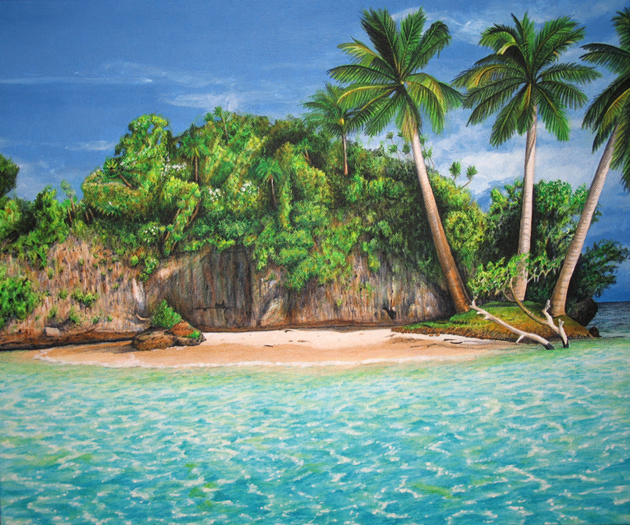 This is a tribute painting to my pet chameleon who passed away a few years ago. His name was Budders. I hid my pet chameleon in a landscape that would appear to be bliss for this kind of lizard. Or is it the ideal paradise for myself? Therein lies the question. The size is 16" x 20". Done in acrylic.