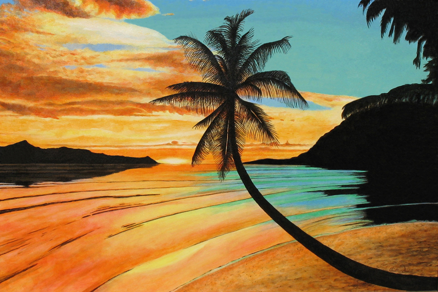 Sunset shot from the caribbean. A palm tree silhouette is the focal point and then the eye takes in the rest. The size is 24" x 32". Done in acrylic. (Giclee not available.)