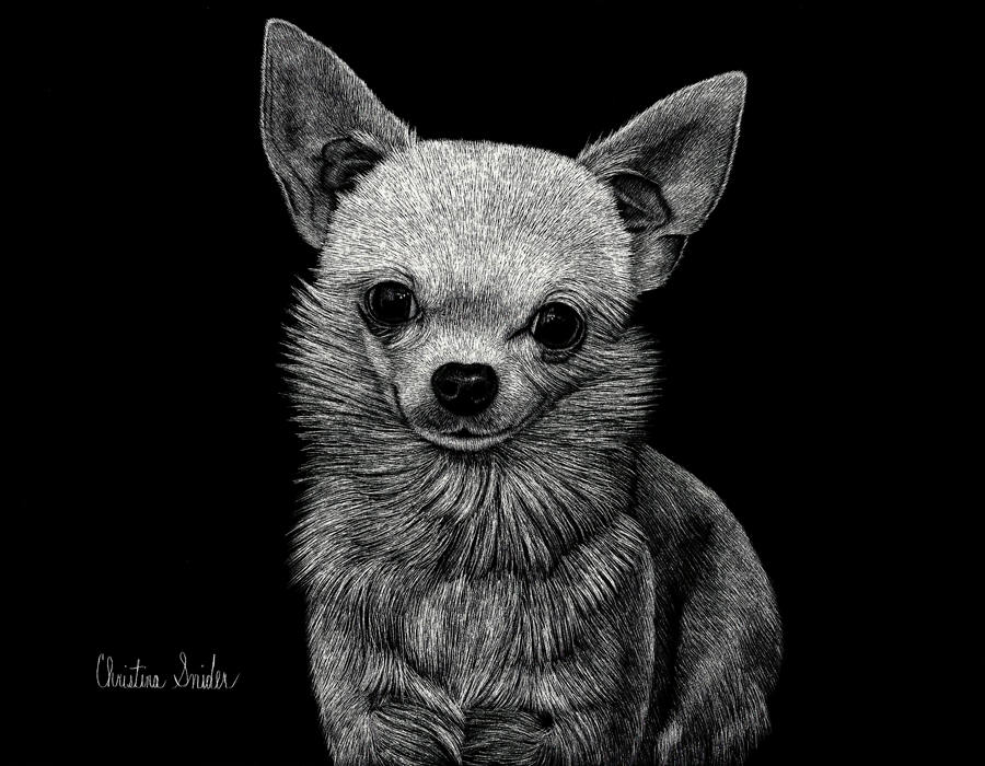 Portrait of a Chihuahua named Paco. Done on scratch board with exacto knife. Completed 7/1/2015. Size 8 1/2" x 11"
