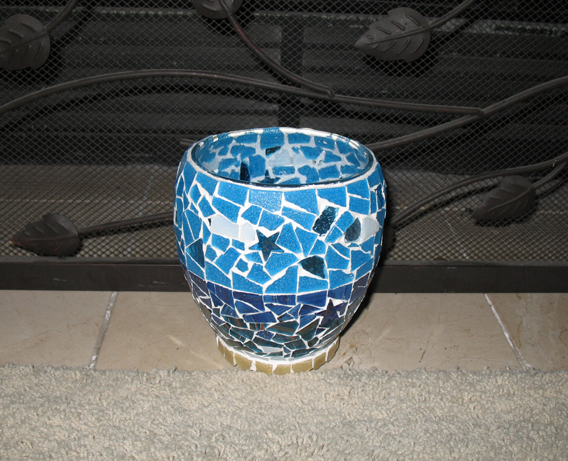 This is another candle holder/vase but with a different shape. It is nice how the curvature of the glass really accents the tiles. This one has a beach like feel to it. All of the vases can also be used as a lamp with a night light. Ask about the optional light attachment. Size is about 5 1/2" tall and about 5" in diameter.