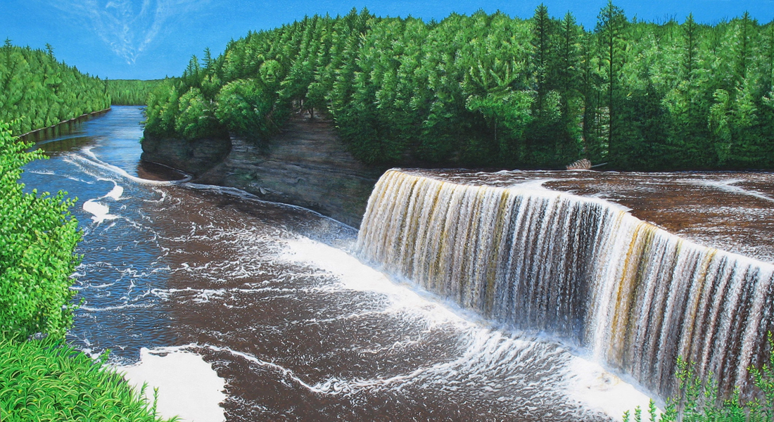 This is a panoramic painting of Tahquamenon Falls located in the upper peninsula in Michigan. I took many photographs when I visited these falls in 2011. I took three of the pictures and stitched them together in photoshop. I used the panoramic photo I created to paint this piece. I also hid 7 animals in the landscape that are natural to the habitat. The animals hidden are a bear, moose, otter, raccoon, wolf, rabbit and an eagle. See if you can find them all. The size is 24" x 48". Done in acrylic.