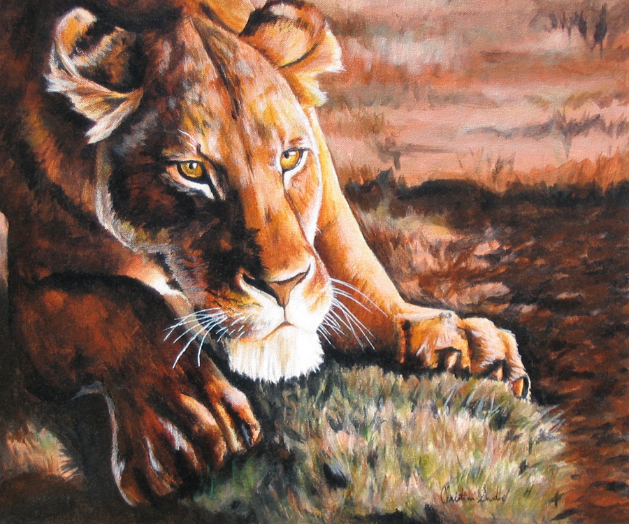 This is a painting of a female lion ready to pounce. Light and shadow are key components in this piece. The size is 16" x 20". Done in acrylic. (Giclee not available.)