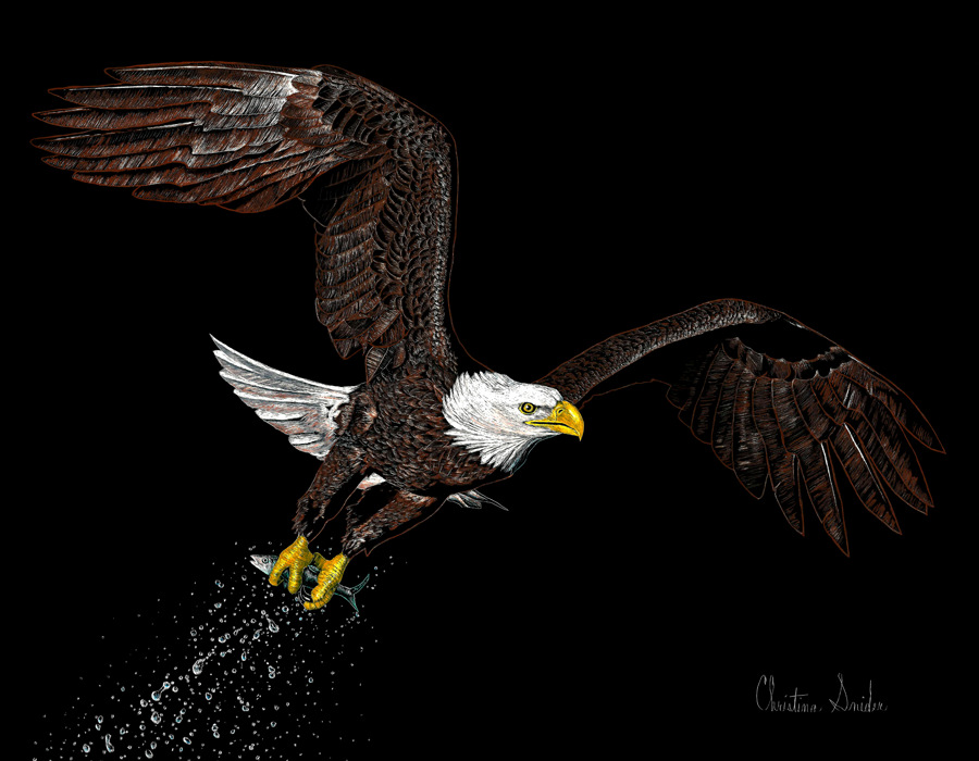Scratch board of an eagle that has just caught a fish. Done on scratch board. Size 11" x 14", Completed 9/2014.
