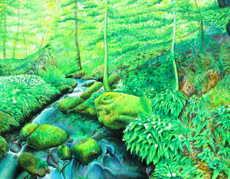 This is a forest landscape with a stream running through it. This painting is mostly about the color rather than the detail. The size is 22" x 28". Done in acrylic. (Giclee not available.)