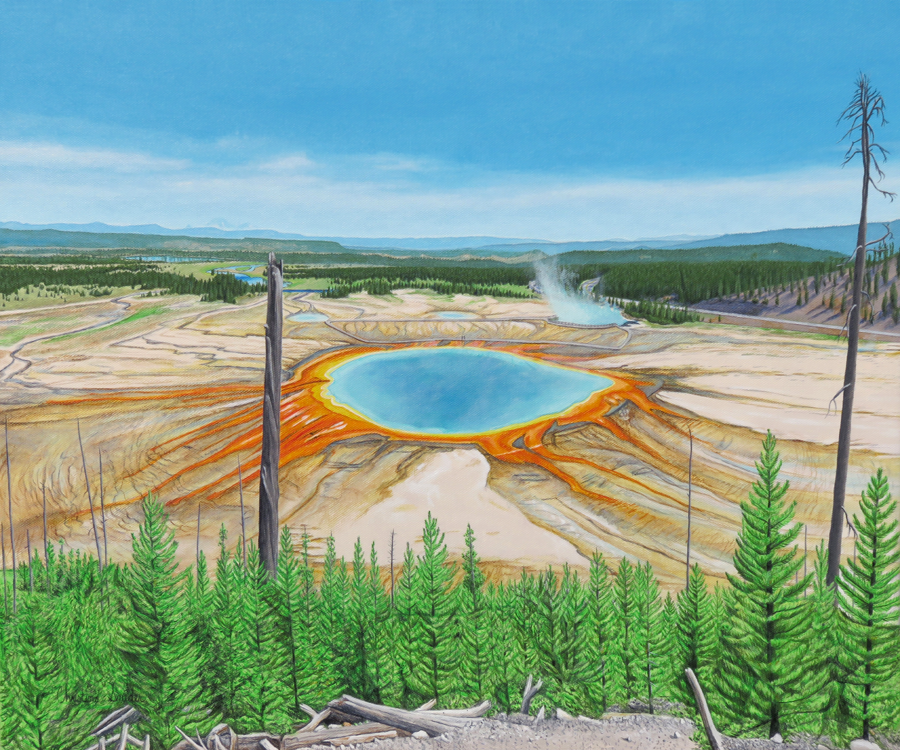 This is a painting of a beautiful landscape photograph I obtained by climbing a mountain on the Fairy Falls Hike (about 1/2 a mile into the hike) in Yellowstone National Park in July, 2014. The colors of this large hot spring drew me in instantly. There are three animals hidden in the trees in the foreground (wolf, elk and a bear). The size is 18" x 24". Done in acrylic. Completed 10/22/15.