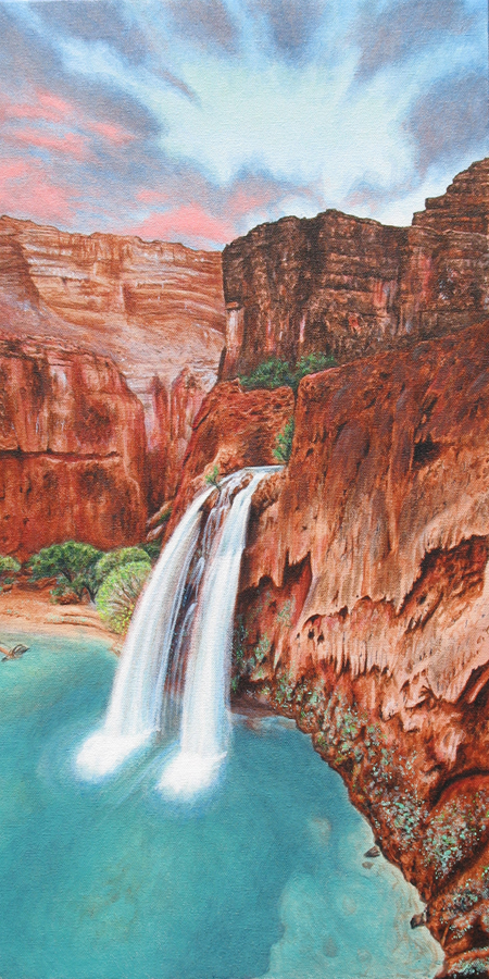 This is shot of a falls located in the Grand Canyon. The colorful sky indicates that it must have been close to dusk at the time of the shot. The size is 24" x 12". Done in acrylic. (Giclee not available.)