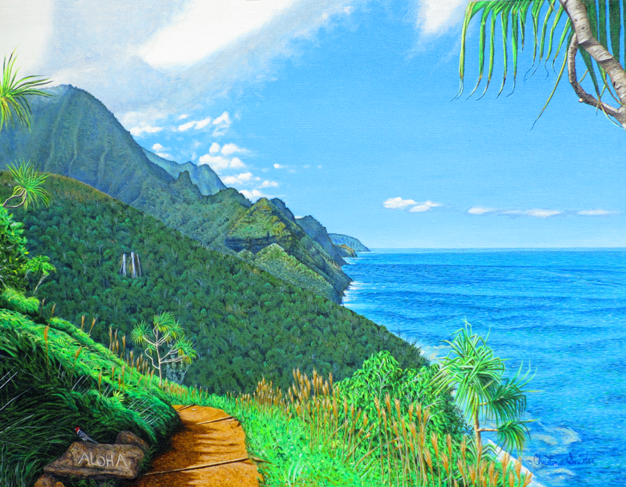 Vacation collaboration landscape painting of Hawaii. Done as a wedding gift for a friend. Size 16" x 20". Acrylic on canvas. Completed 2/2014.