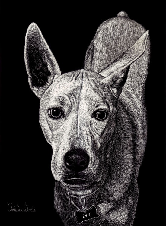 Portrait of my sister's dog, Ivy. Done on scratch board with exacto knife. Completed 9/22/2013. Size 8 1/2" x 11"