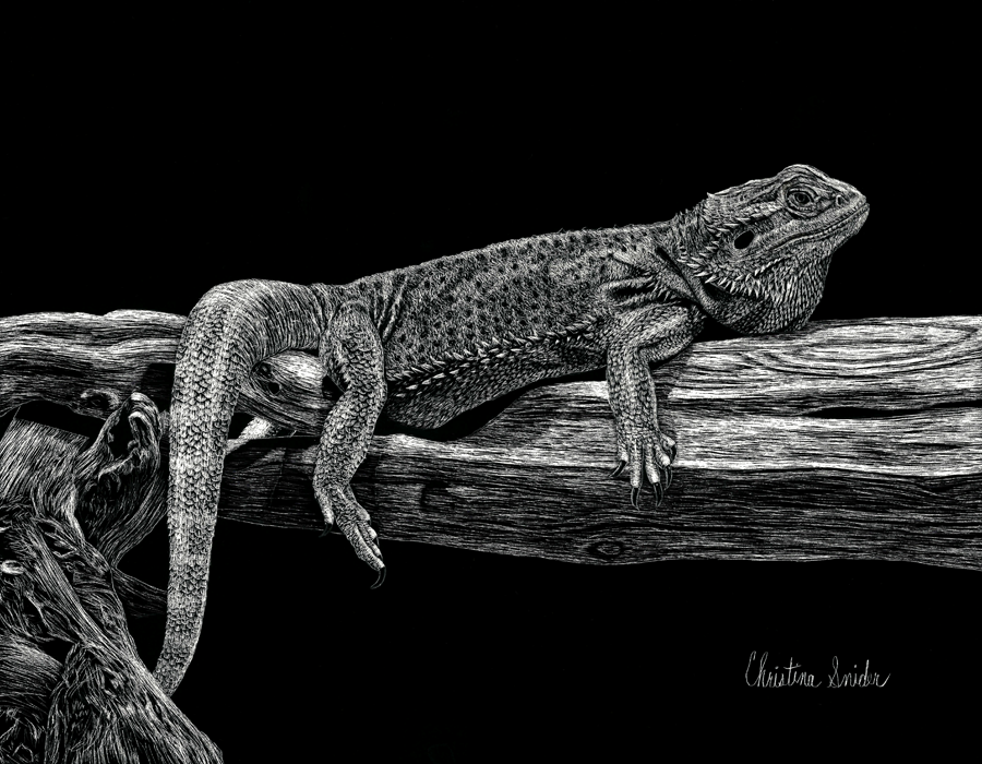 Scratch board of a bearded dragon named Jib. The bearded dragon is such a sweet docile animal. Done on scratch board. Size 8.5" x 11", Completed 4/24/2015.