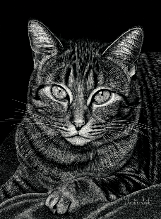 Portrait of a common type of cat used for a promotional piece for a pet show called the Chicago Pet Show. I shall call it Kitty. Done on scratch board with exacto knife. Completed 4/2015. Size 8 1/2" x 11"