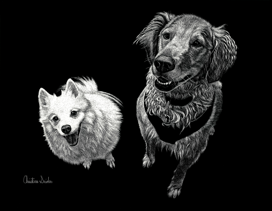 Scratch board of a client's two pups, Lacy and London. Done on scratch board. Size 11" x 14", Completed 1/18/16.