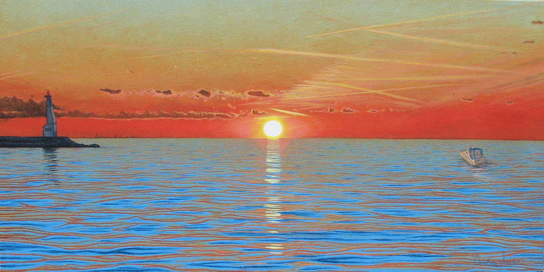 This is a panoramic sunset in Michigan City, IN. This is a great sunset shot from the water. Sunsets can be really impressive on the water with all of the warm colors bouncing off of the surface of the water. If you look closely, you can see Chicago in the background. The size is 12" x 24". Done in acrylic.