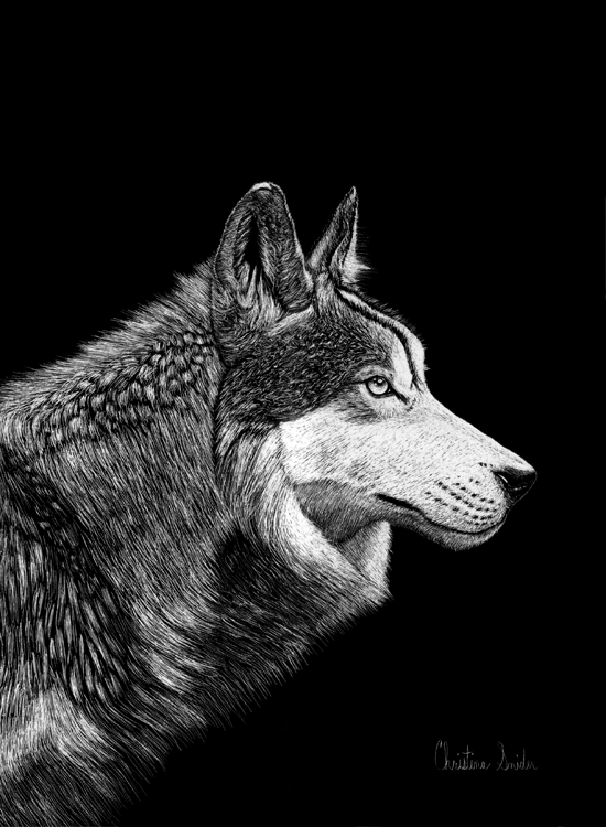 Profile of a lone wolf. Done on scratch board with exacto knife. Completed 8/2013.