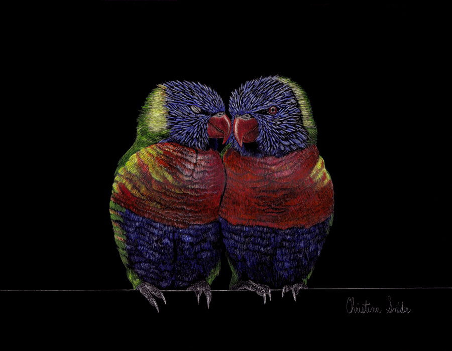 These colorful love birds are called Lorikeets. Puffy, cute and colorful. Done on scratch board and painted in color with gouache. Completed 8/2013.