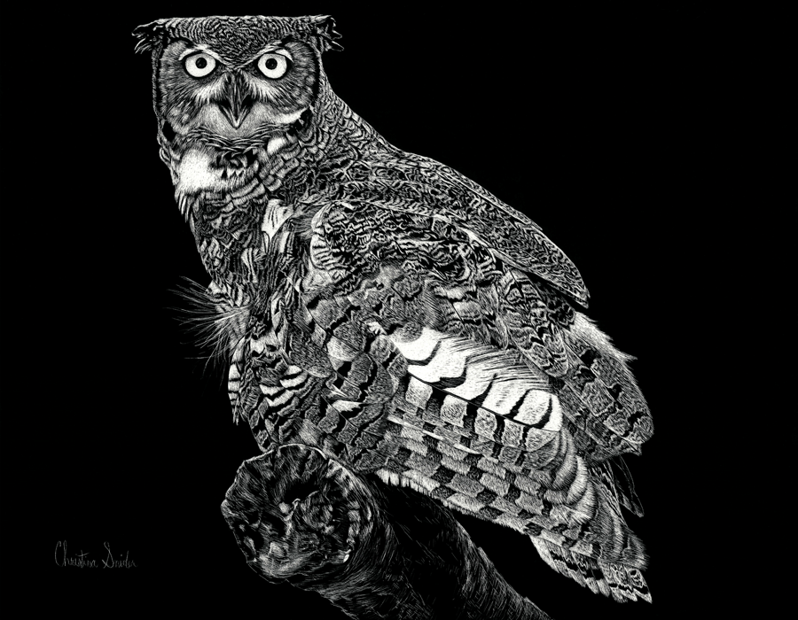 Second piece I did with this owl. The owl has turned it's piercing gaze directly on the viewer. Done on scratch board. Size 11" x 14", Completed 11/2014.