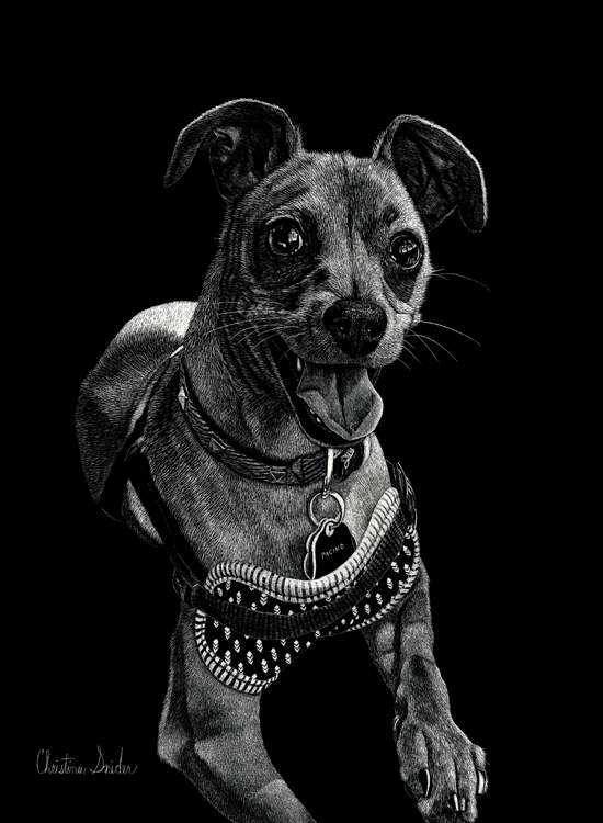 Portrait of my brother and his girlfriend's miniature Pinscher named Pacino. Done on scratch board with exacto knife. Completed 12/2017. Size 11" x 14"