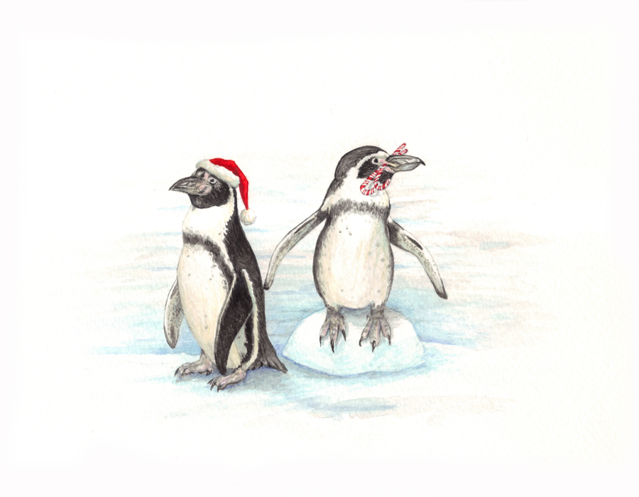 This is an illustration for a seasonal greeting card. Penguins are a cute way to spread holiday cheer. I used the negative space on the page to make the penguins the only focal point. Done in gouache.