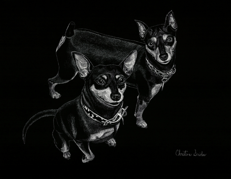 Scratch board of my mom and dad's dogs named Pesche and Princess. Done on scratch board with exacto knife. Size 11" x 14", Completed 12/2017.