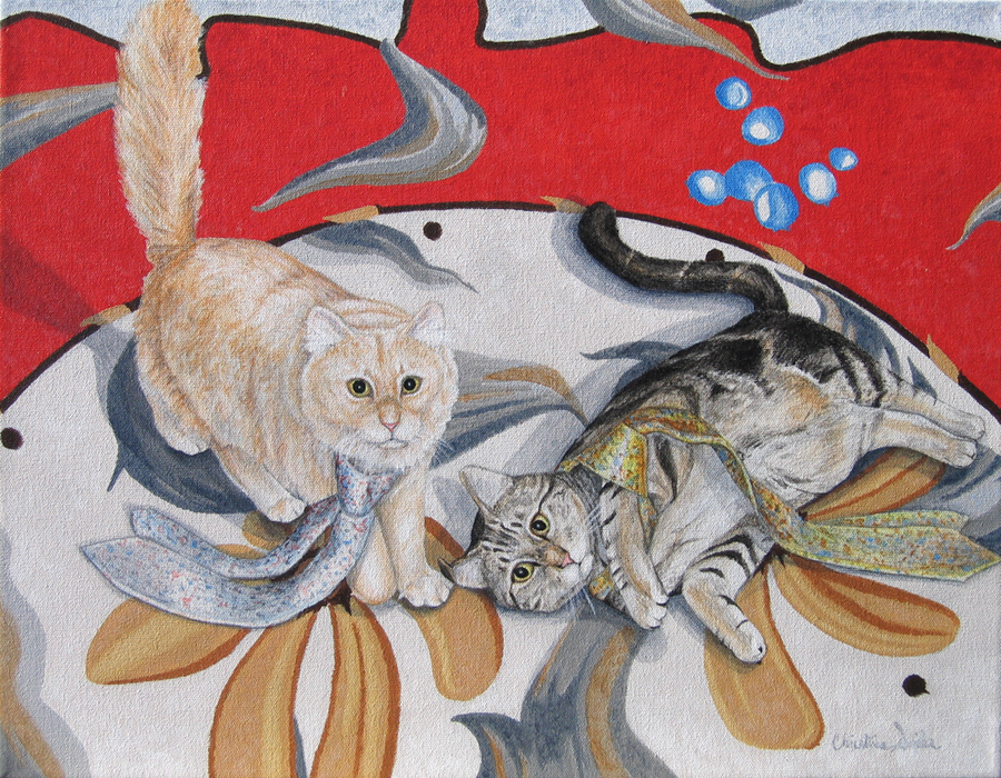 This is a painting that I did as a wedding gift for my friends, Peter and Barbara. It is a cute and comical portrait of their pet cats, Jack and Pixie. I think they enjoyed wearing those ties! The size is 16" x 20". Done in acrylic paint.