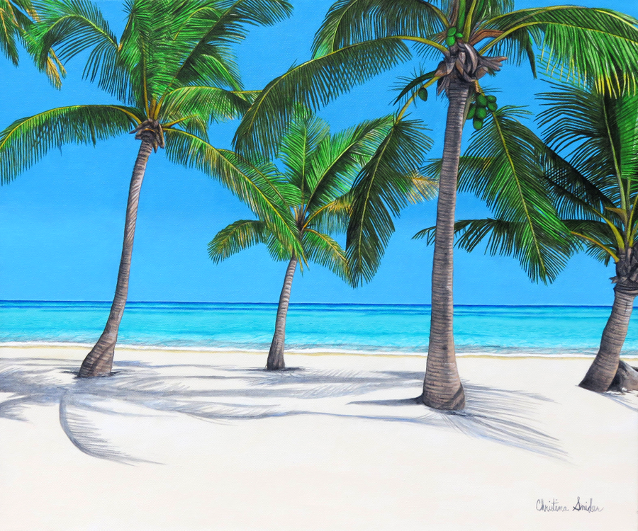 A wedding gift painting for a cousin of a Punta Cana Beach scene. A simple yet complicated painting that involved serious details in the trees and a simplistic background. The size is 16" x 20". Done in acrylic on canvas. Completed 06/2017.