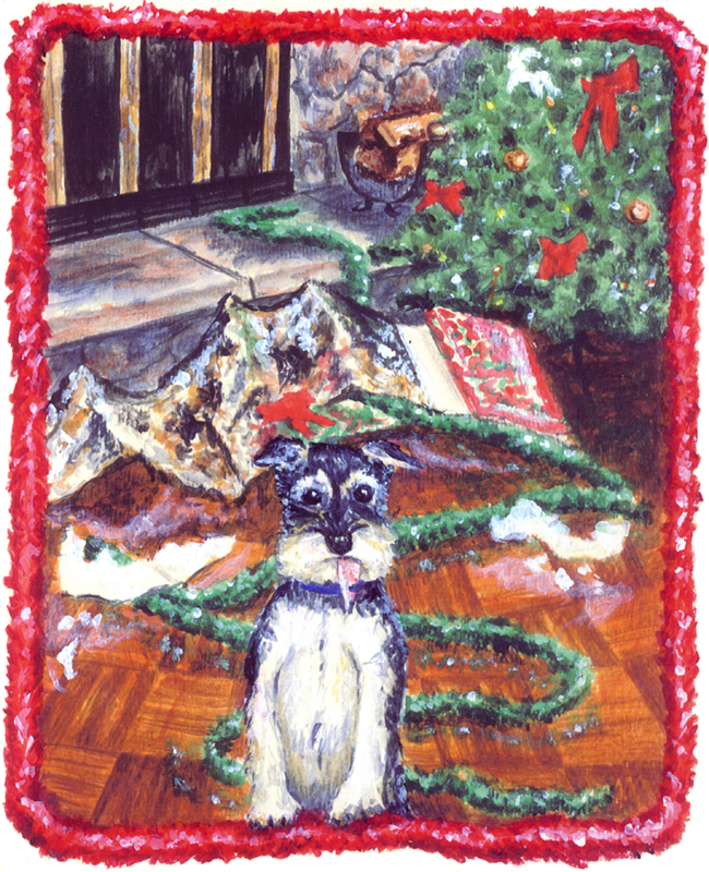This a holiday greeting card design. I used my mom's dog, Kaiser as the model for a cute depiction. Dogs are notorius for getting into Christmas presents and wrappings. Done in acrylic.