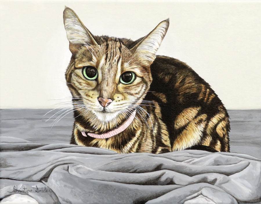 Commissioned portrait of a beloved pet cat named Shyla. The size is 11" x 14". Acrylic on canvas. Completed 11/2021.