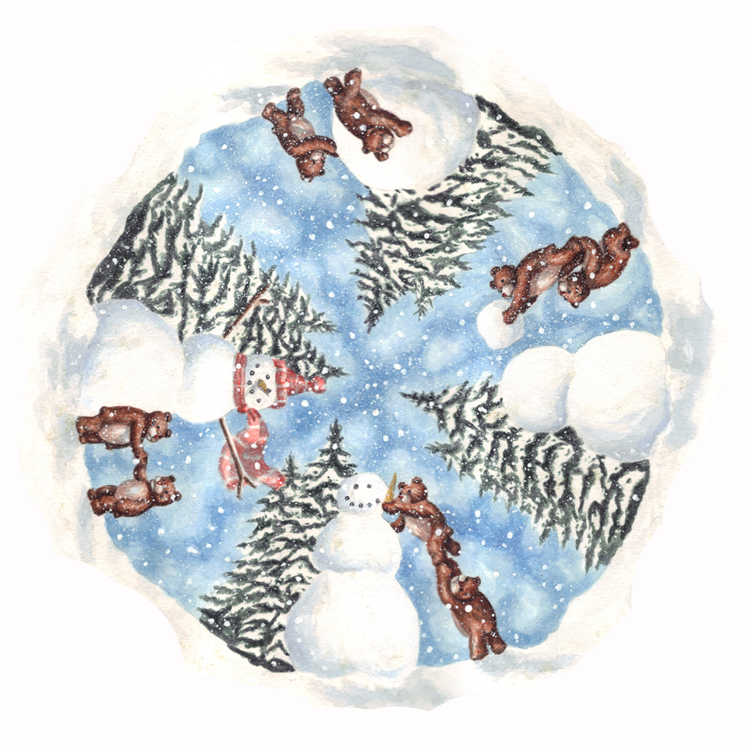 This Illustration was done for a holiday tin/plate design. Cute little bears cooperate to build a snowman in a step-by-step sequence. Done in gouache.