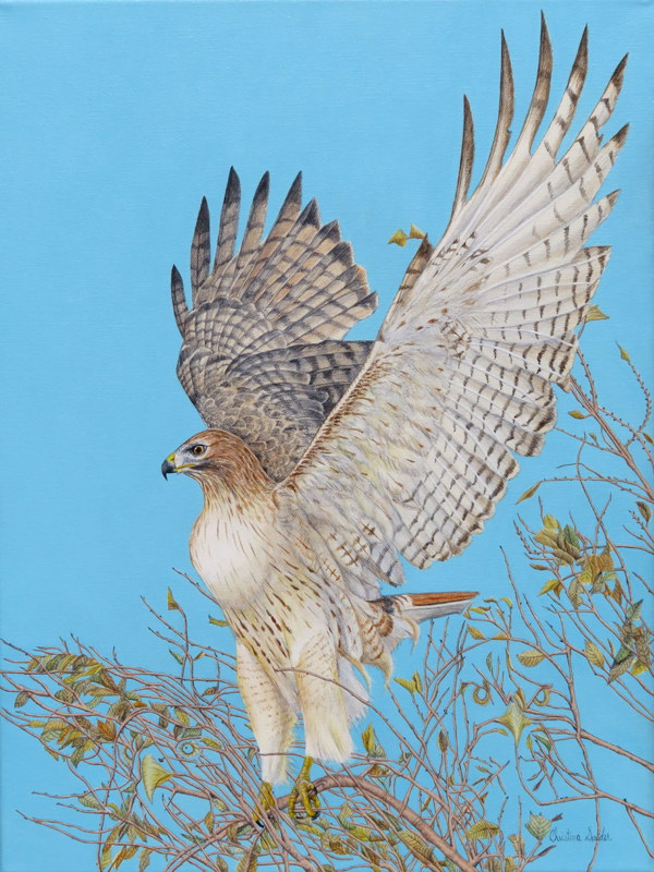 This piece was commissioned by one of my best customers! She wanted the strength of the hawk conveyed in a painting. I painted the hawk and to add to the spirit of strength, I hid 2 more hawks in the leaves and twigs. The word stark is actually the german word for strong. The size is 16" x 20". Done in acrylic.