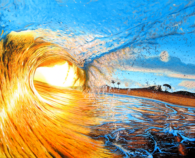 Tube wave from a surfer's point of view at sunset. The splashes of color and perfect timing of this picture were a great inspiration for me. Done in acrylic. Size 18" x 24".