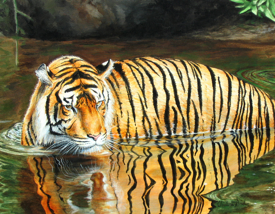 In this piece, I painted a tiger taking a swim to cool off. It's reflection is dancing on the water. This is not my usual color scheme. Orange, green and brown earth tones dominate this piece. The size is 22" x 28". Done with acrylic paint. (Giclee not available.)