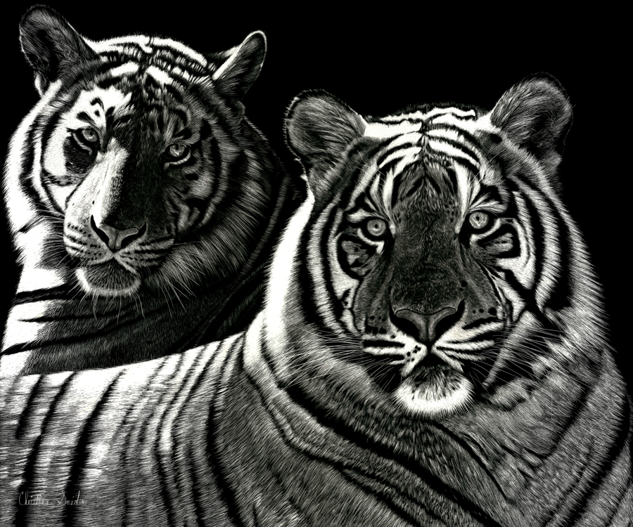 Tiger mates that I found in a great little zoo in the upper peninsula of Michigan called Garlyn Zoo. These tigers appear to live quite happily together. The tigers' names are Miko and Katerina. Scratch board, Size 16" x 20" (Completed 01/18/15).