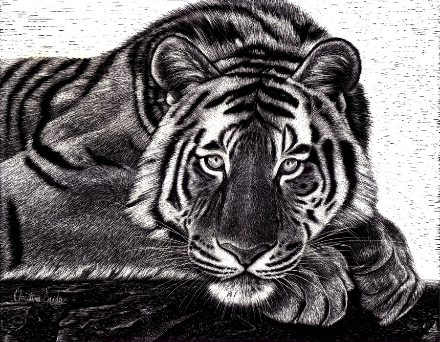 Took a different approach on this one and scratched off the background instead of leaving the black surface. Done on scratch board. 8 1/2 x 11. Completed 9/2013.