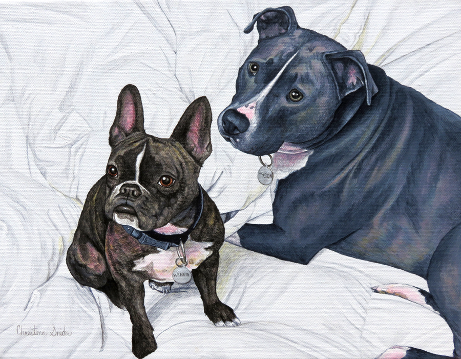 Portrait of two pups that are clearly best friends. These two are named Tyson (right) and Winnie (left). This piece was commissioned by a client who wanted to surprise his wife for her birthday. The size is 11" x 14". Done in acrylic on canvas. Completed 05/16.