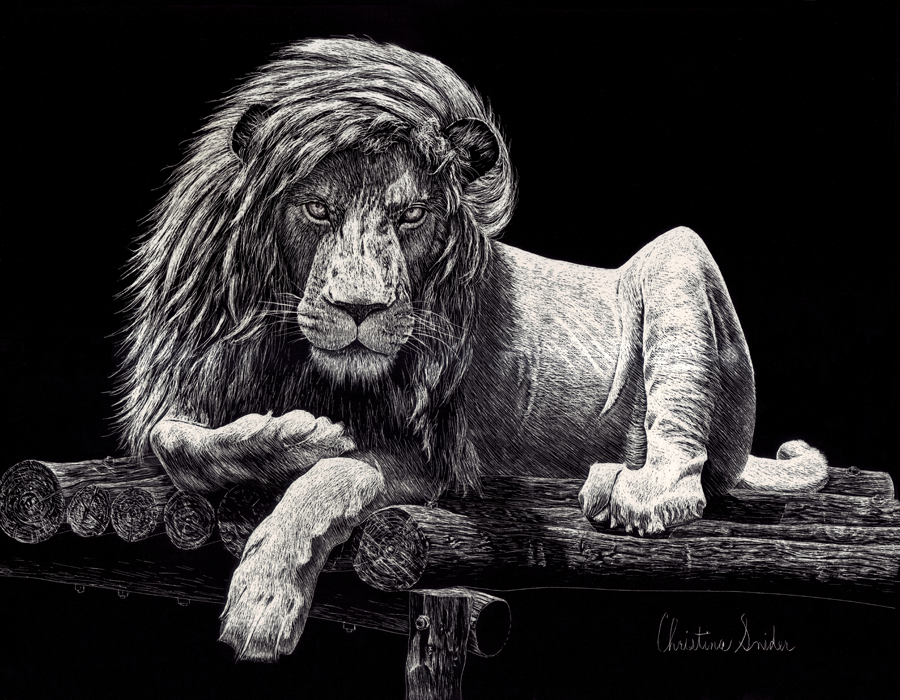 Love the lion because I am a Leo. This is a lounging white lion on a windy day. Done on scratch board.