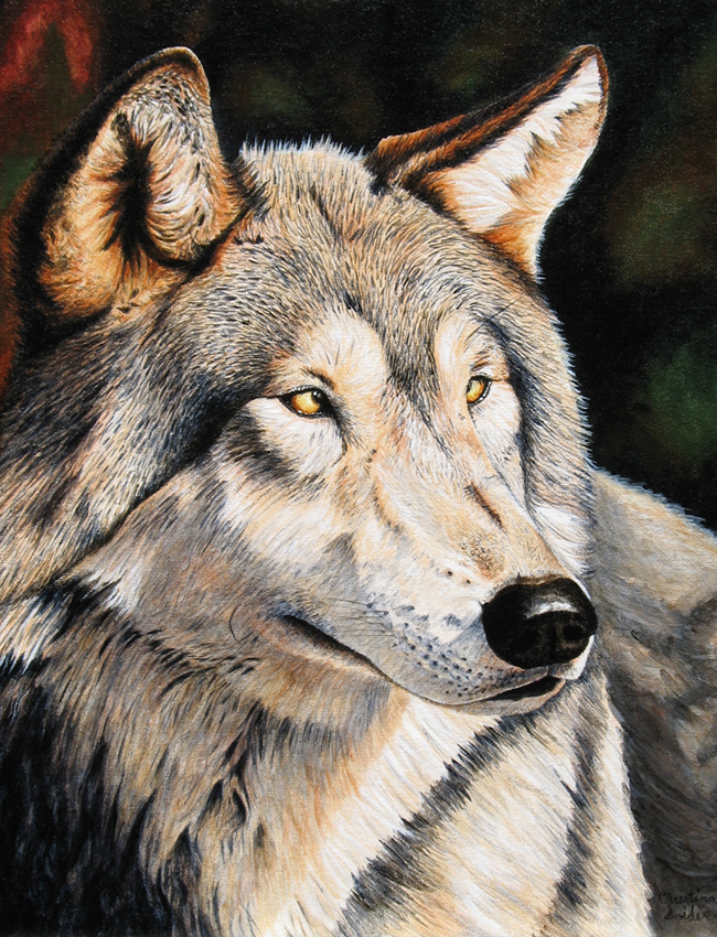 This is a portrait of a wolf. Wolves are one of my favorite kinds of animals to paint besides lions and tigers. They are mysterious and majestic. Cruel, yet intelligent. An animal that is both feared and respected. The size is 16" x 20". Done in acrylic. (Giclee not available.)