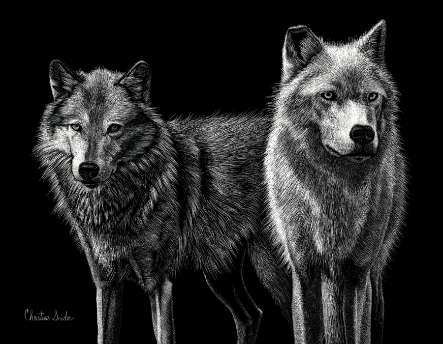 Scratch board of a white wolf and his mate from West Yellowstone. I photographed these two in the Grizzly and Wolf Center. Done on scratch board with exacto knife. Size 11" x 14", Completed 11/2017.