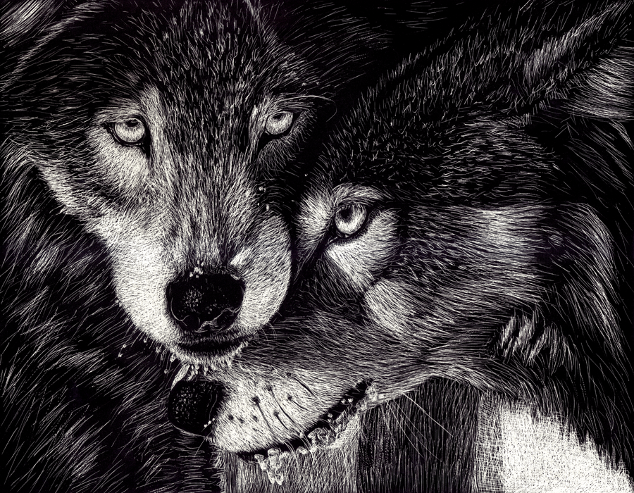 This picture shows the compassion two wolf mates can appear to have for one another. Done in scratch board.