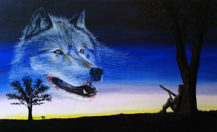 This an illustration inspired by a story where a wolf spirit gets revenge on the hunter who killed it. Story had a menacing feel to it. Done in acrylic.