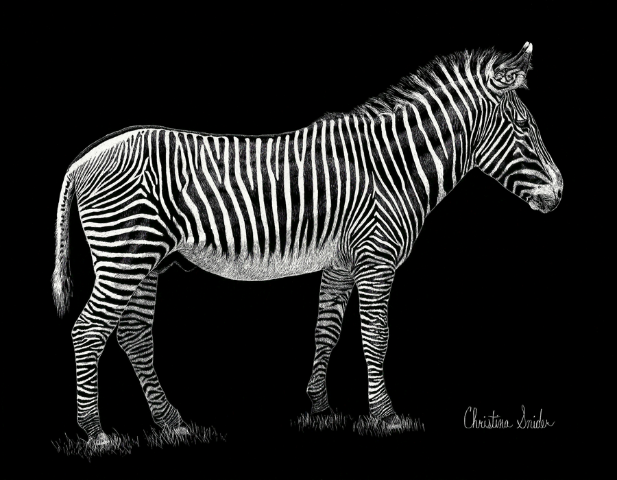 Scratch board of a zebra from Brookfield Zoo. This was a surprisingly difficult piece. Done on scratch board. Size 8 1/2" x 11", Completed 5/2015.